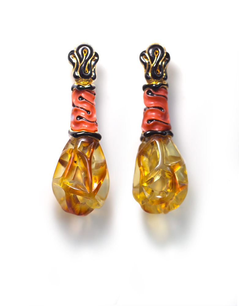 “I believe amber is a wonderful material that lends itself excellently to figurative work. Unfortunately, it often suffers from being worked on at a rather basic level, reduced to meaningless pearls and beads. There are two aspects of amber that I particularly admire: its historical significance as a carrier of meaning in archaic pieces and the extravagant use of it during the Baroque era.In my own work with this material, which took place between 2005 and 2010, my aim was to encapsulate these two components on a miniature scale and adapt them into contemporary jewelry.”